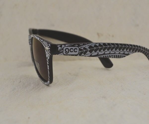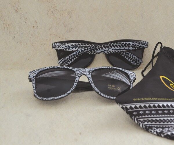 GCC’s wayfarer style sunglasses have a white traditional motif printed on black plastic frames. They feature plain grey lenses with UV400 protection.